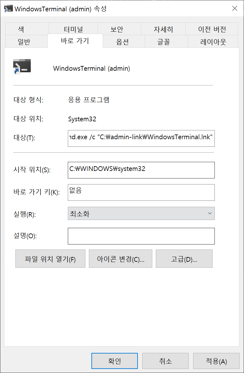 이름은 자유롭게 지으면 된다. 나는 뒤에 (admin)을 더 붙였다. 마지막으로 새로 생성된 바로가기를 우클릭해서 '실행' 콤보박를 '최소화'로 바꿔주고 아이콘을 바꿔주면 끝이다.