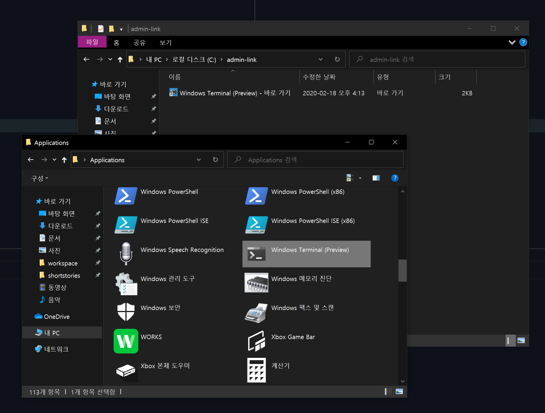 준비한 파일 탐색기의 주소 입력 칸에다가 shell:AppsFolder 를 입력한다. 그럼 지금까지 스토어 등을 통해 설치한 앱들이 나올 것이다. 여기에서 원하는 UWP 앱을 찾아 미리 준비한 C:\admin-link 로 드래그 앤 드랍을 해서 바로가기를 만든다. 만들어진 바로가기의 이름은 자신이 입력하기 쉬운 것으로 바꾸는게 좋다. 나의 경우 WindowsTerminal 으로 바꿨다.